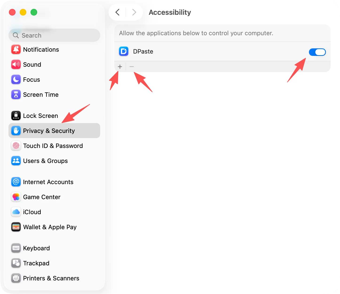 If DPaste is already in the Accessibility list but still cannot paste, try removing and re-adding it by following these steps: