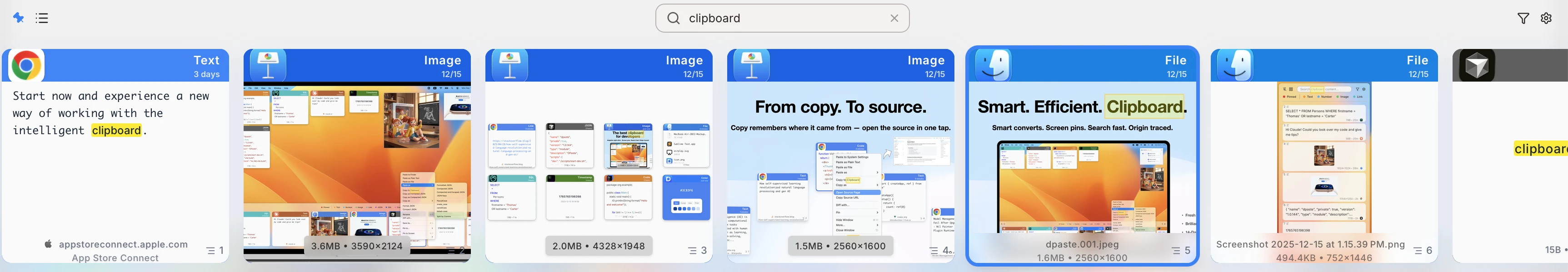 ⌘ + F or start typing directly in the clipboard to automatically open the search box. The powerful search function can not only match text but also match your image content.